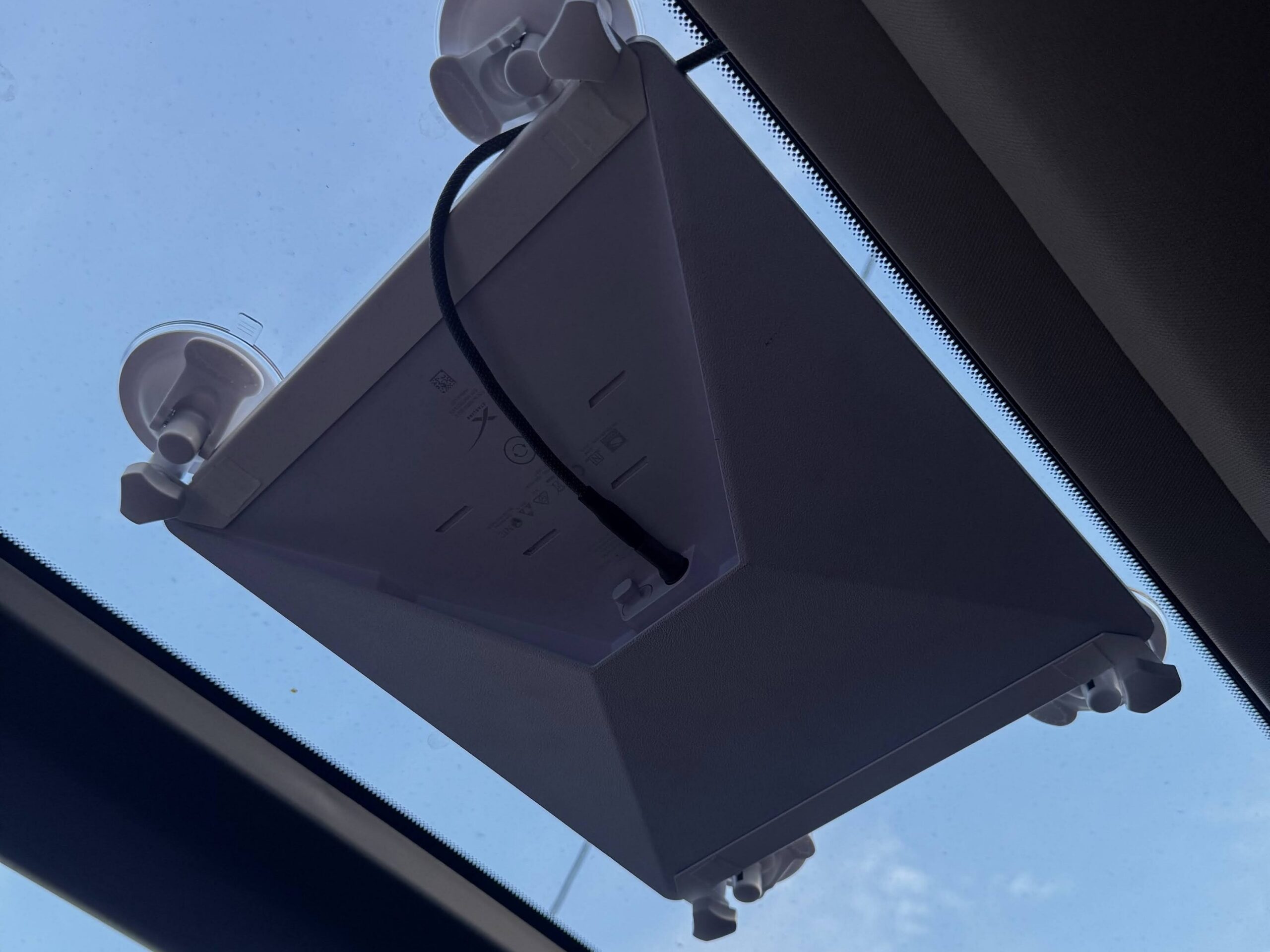 Our first load on the EcoFlow is none other than the Starlink Mini, mounted permanently under the moonroof with suction cups- I used a dab of water to help with the seal. Windows are mostly (completely?) invisible to RF waves and data works spectacularly through it, only cutting out briefly when driving under bridges or trees.