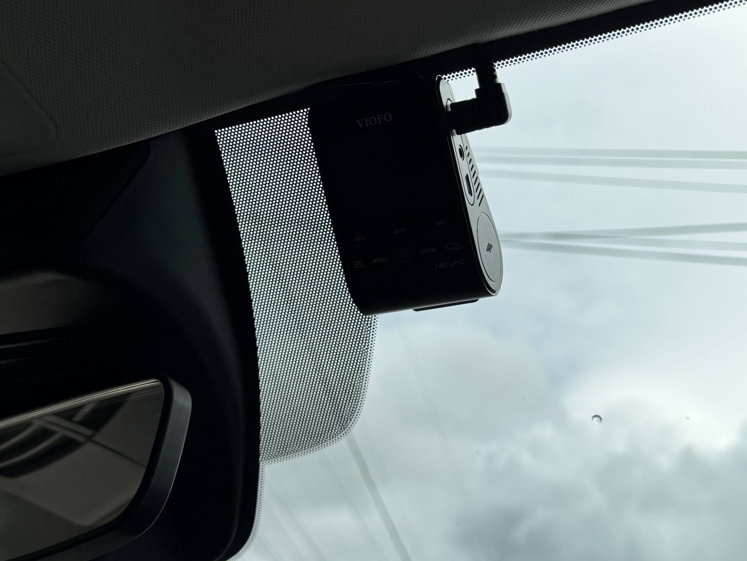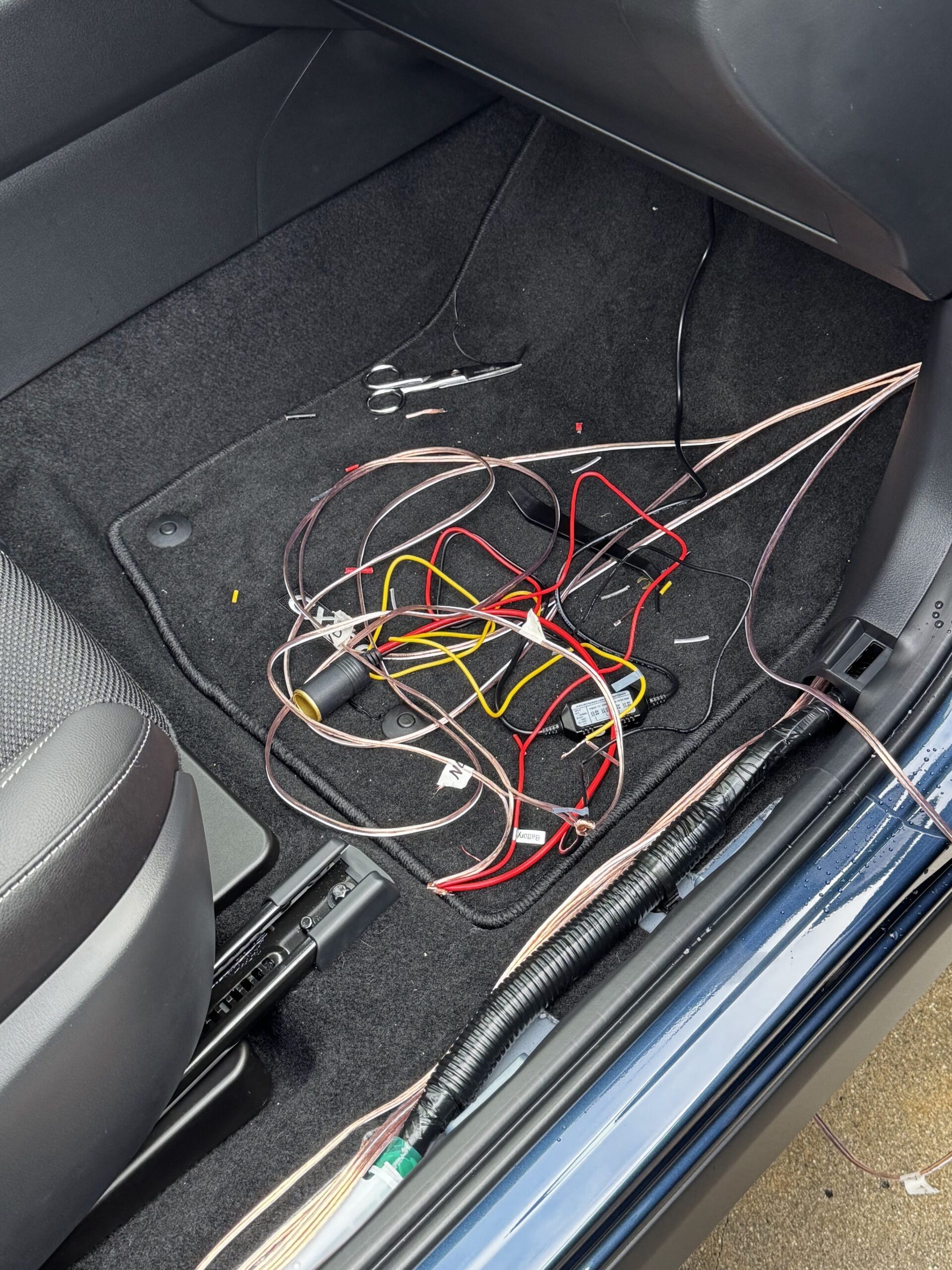 Next we have our dashcam. This two piece front + rear camera (not shown) is capable of entering a low power / parked mode if we give it both always on power + a switched circuit. To do this, I have another relay set up just like the earlier one on the car’s switched circuit, but instead of passing power from the car’s main bus, this one is fed from a 12v cig lighter port off the EcoFlow. This means both always on & accessory power come from the EcoFlow- no draining the car’s battery! Run those cables along the side of the car.
