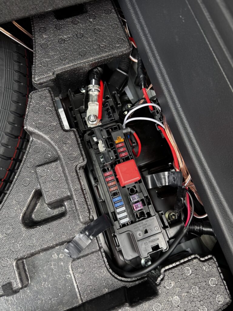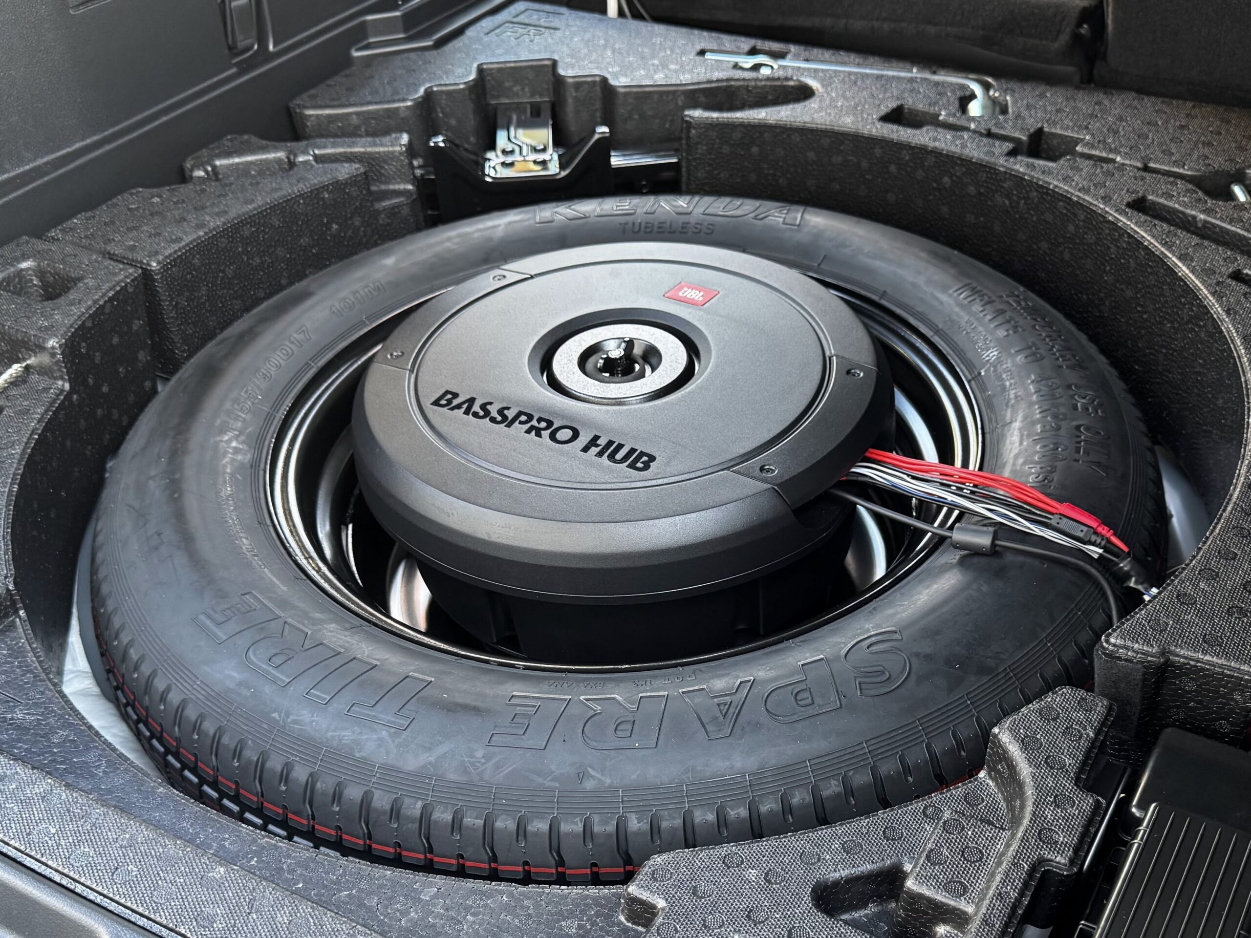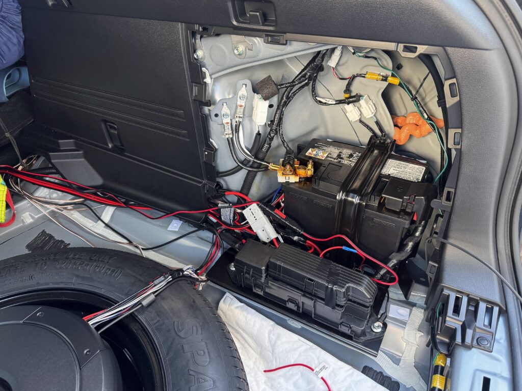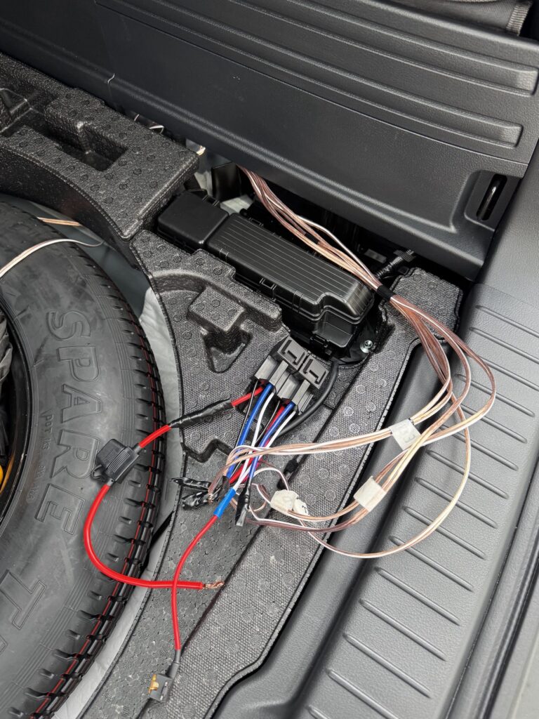 I love that it fits in the spare tire and doesn’t take any cargo space at all. I used Posi-Taps to pull audio from the two stock subs at the front of the car. I explored pulling signal from the amp under the passenger seat but it was really tight and I did not feel like taking the seat off.